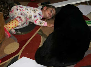 So I was cooking one day and found it odd that Mia was quiet for a few minutes and not insisting on "helping" me in the kitchen. I went to the living room and found her painting the black dog white! I had a paintbrush in a baggie for future use that she found and decided her dog needed to look more like a skunk. Silly girl. Poor dog.